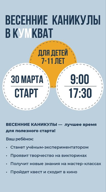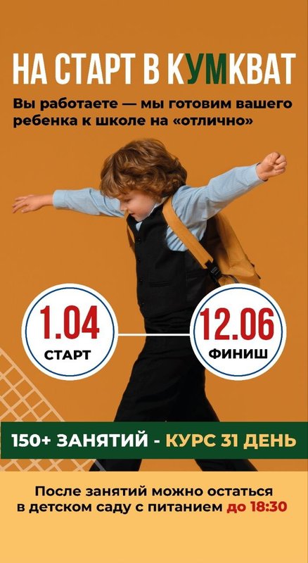 Здесь бережно развивают интеллект детей и подготавливают их к взрослой жизни в новой информационной эпохе. Педагоги не только занимаются подготовкой к детскому саду и школе, обучая различным навыкам и техникам коммуникации. Именно после таких занятий детки начинают осознавать себя как взрослые личности и уже в раннем возрасте начинают понимать, чем хотят заниматься в жизни. Не стоит экономить на времени и развитии ваших детей, они - это ваше будущее. Развивающий детский клуб кУМкват предлагает вам достойное место, где готовы развивать интеллект ваших детей, учить их навыкам общения, показывать пример искренней дружбы, а также учить их не бояться всех трудностей, которые могут встретиться на жизненном пути.
